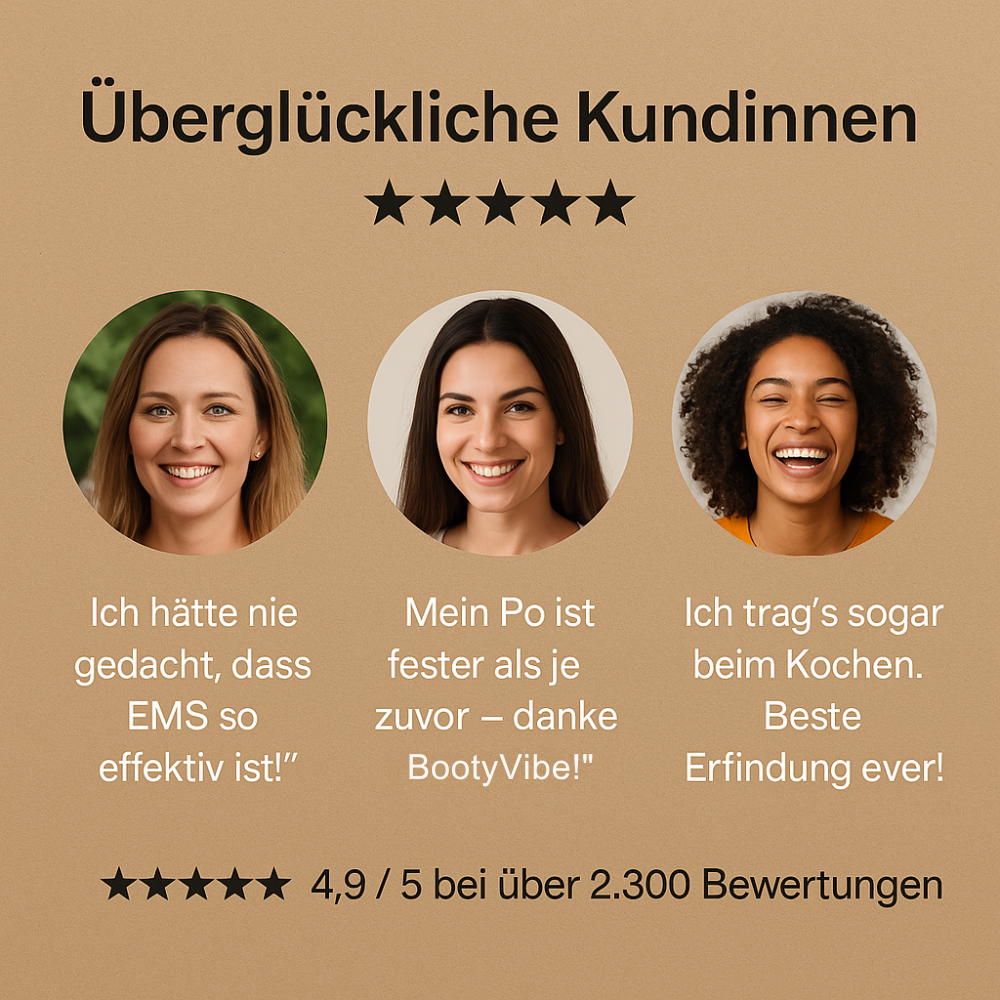 Nina M. April 2025Verifizierter KäuferIch sehe schon nach 10 Tagen einen Unterschied!Ich war skeptisch, aber BeautyVibe ist der Wahnsinn! Ich nutze es jeden Abend auf der Couch, und mein Po ist schon viel straffer geworden. Kein Fitnessstudio nötig – ich bin begeistert!BootyVibe